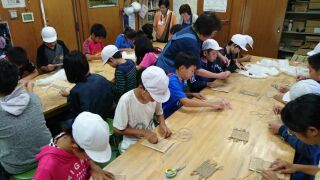 縄文時代のおり方の1つ,平織りという方法でコースターを作っています。完成したらお土産として持って帰ります。