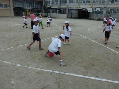1年生全体でころがしドッジボールをしました。対戦を楽しんでいました。