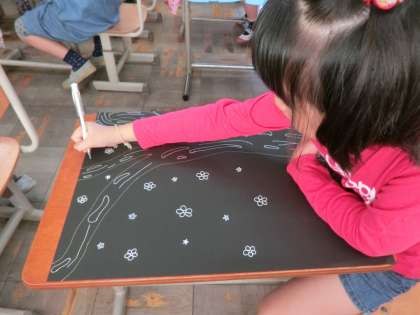 進めています。黒い画用紙にペンで線描をしています。