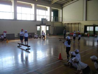 平均台を使って「どんじゃんけん」をしました。点が入ったらみんなで盛り上がりました。