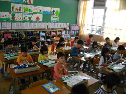 ドレミファソを使ってけんばんハーモニカの練習をしています。最初は,「むずかしい!」という子も何回もやるごとに「できた!」「やった!」という声が多くなって,うれしいです。