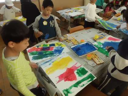 ローラーやスタンプを使って模様を作りました。この後,こすり出しで作ったものと合わせて作品に仕上げていきます。