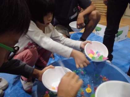 体育館で,いろいろなゲームをして楽しんでいます。みんな班のなかまと仲よくチャレンジして,笑顔がいっぱいです!