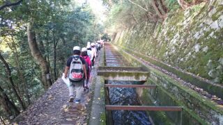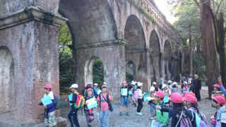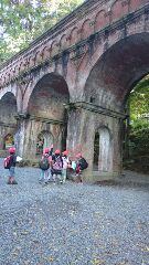 水路閣に到着 高さを予想中です。みんな真剣に考えています。