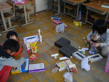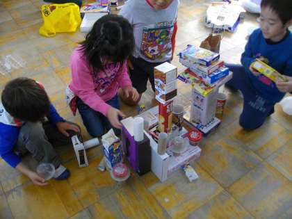 図工で,箱を組み合わせていろいろな形をつくりました。子どもたちの発想は,すごいですね。