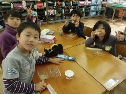 5年生が育てたもち米を使って,今年も収穫祭がありました。おもちつきをしてものを1年生に持ってきてもらい,みんなでおいしくいただきました。