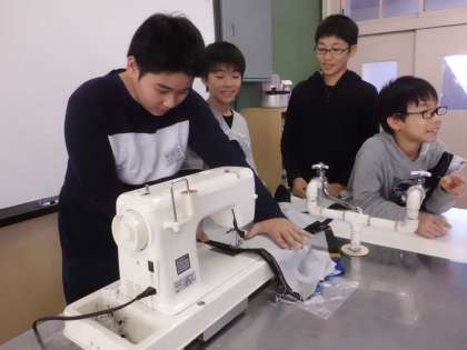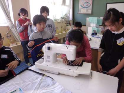家庭科のエプロン作りも残りあとわずかになりました。ミシンの扱いにもだんだんと慣れ,友達と協力しながら製作しています。仕上がりが楽しみです。