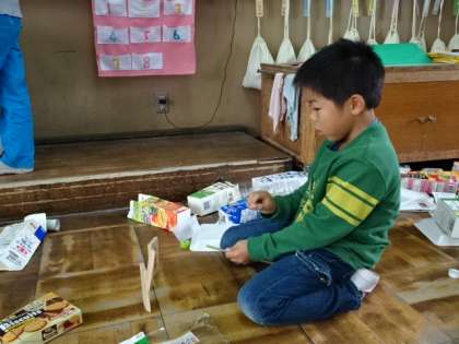 生活科の学習「あそんで ためして くふうして」で,廃材を使って遊びを考えました。