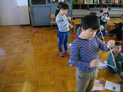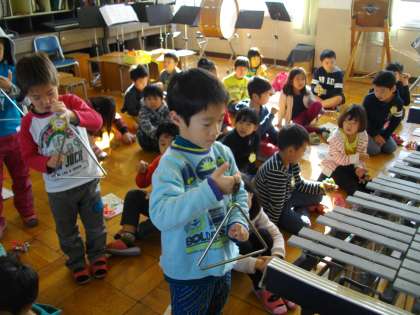 1年生も音楽室で学習しています。きらきらぼしをトライアングルやすずをつかって演奏しています。いろいろな音を楽しみながらがんばっています。