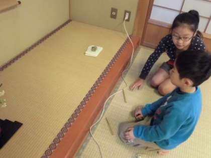 今日は,茶道体験教室でした。茶道部活でも教えていただいている地域の大岡千恵子先生にお世話になり,体験教室を行いました。参加者は,32名。大変たくさんの子どもたちが参加してくれました。低学年の子どもたちが多かったのですが,高学年の茶道部の子どもたちが,とても上手に教えてくれました。