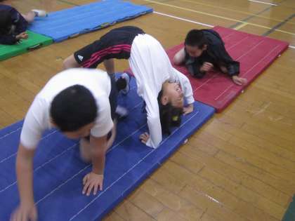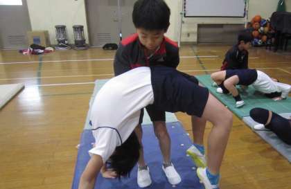 体育の学習では,マット運動に取り組んでいます。ブリッジに挑戦しました。友達と教え合いながら,がんばる姿が見られましたよ。