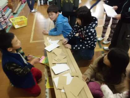 えあわせコーナーです。ひいたカードがドングリ同士,落ち葉同士で合うかな。当たるかな。