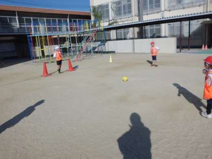 体育でボールけりゲームがはじまりました。チーム練習をしたり,ゲームを楽しんだりしていきます。