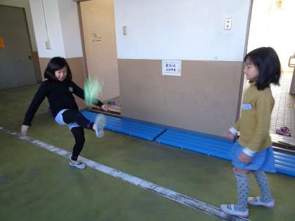 子どもたちは,「サッカーにも似ているよ!」と言いながら,2人組または1人技に挑戦していました。