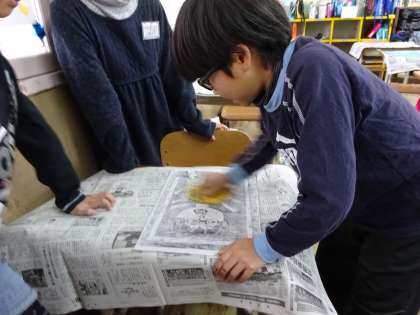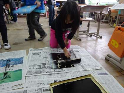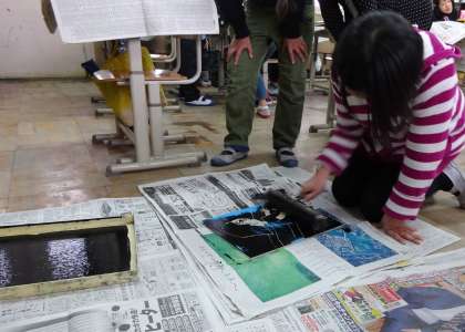 今日は,完成した木版画にインクをつけて和紙にすりました。