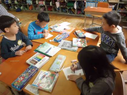 国語の「ものの名まえ」の最後にお店屋さんごっこをするために,各グループでお店屋さんの品物を作っています。さまざまなお店屋さんごとに工夫してがんばっていました。