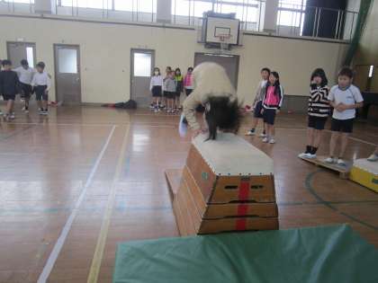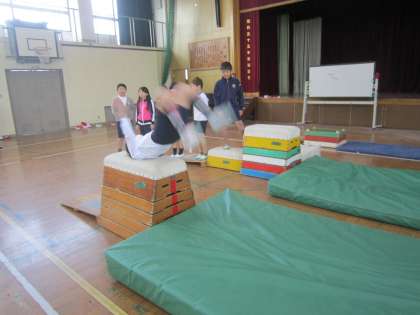 ねらい2では,技にも挑戦しています。台上前転や横かかえこみ跳びの練習をしましたよ。