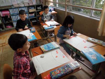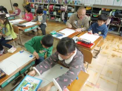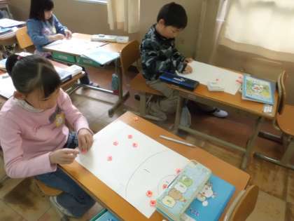 算数で大きなかずに慣れるために「おはじきゲーム」をしました。点数を出すために十の位と一の位をいくつずつかを数えていました。