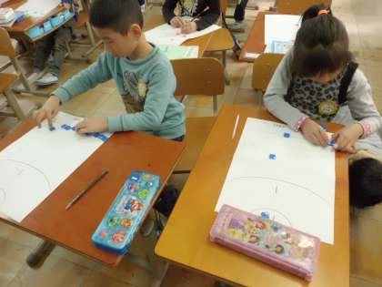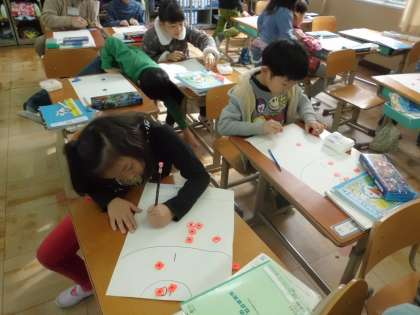 算数で大きなかずに慣れるために「おはじきゲーム」をしました。点数を出すために十の位と一の位をいくつずつかを数えていました。