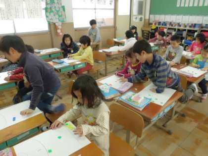 算数で大きなかずに慣れるために「おはじきゲーム」をしました。点数を出すために十の位と一の位をいくつずつかを数えていました。