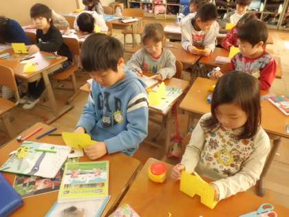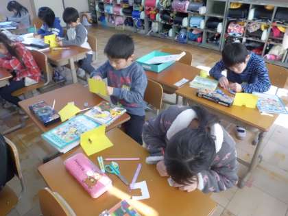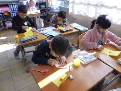 来週,体験入学で来る新一年生のためにプレゼントとしてメッセージカードを作りました。去年の事を思い出しながら,みんな一生懸命に心を込めて作っていました。
