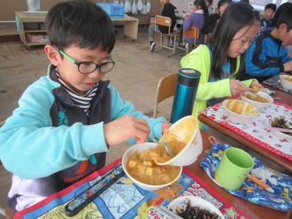 カレーはご飯にかけて食べます。かける時もとても楽しそうです。とてもいいにおいがしてきましたね。