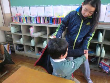 席に案内した1年生に,上着を脱がしてあげて