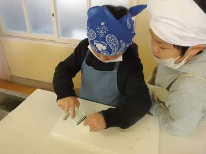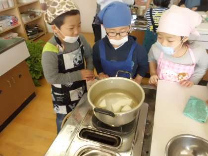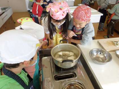 皮をむいた後はゆがきます。泡が出てくるだけでも,ザワザワ・・・みんな楽しみに見守っていました。