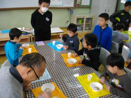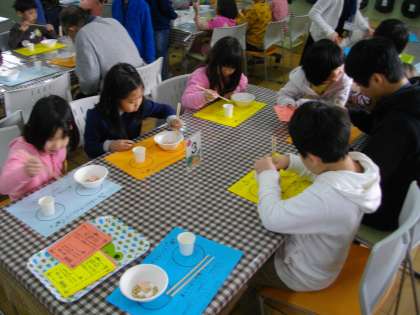 なかなかお箸で豆をつまむのはむずかしいものです。家で練習してきたという子もいて,すごいなと思いました。