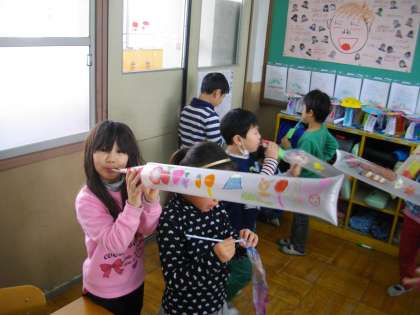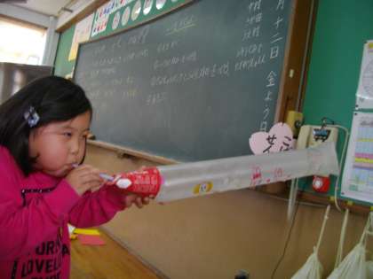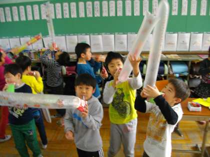 袋に空気を入れると,にょきにょきにょきにょきと絵が出てきました。