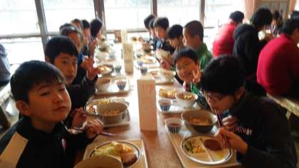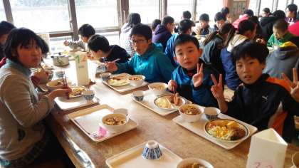 そり遊びの後は,お待ちかねの昼食です。たくさん遊んだので,おなかはペコペコ。楽しくみんなで食べています。