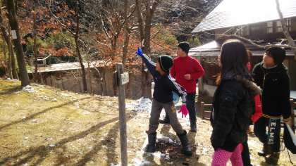 アウトドアでは,フライングディスクゴルフゲームを行っています。足元には少し積もっている雪がみえます。寒さを感じないぐらいのホットなゲーム展開を期待しています。