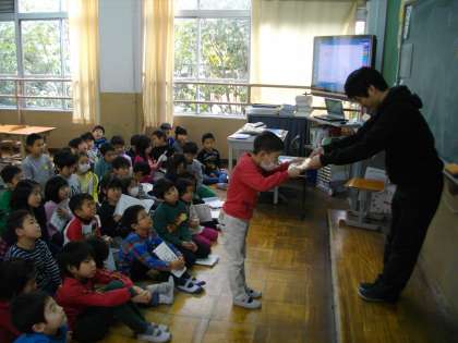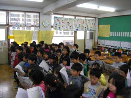 1年生のみんなで人権の花「スイセン」を育てました。今,立派に花をつけています。明日は,感謝状贈呈式があります。式と歌の練習を1年生全員で行いました。