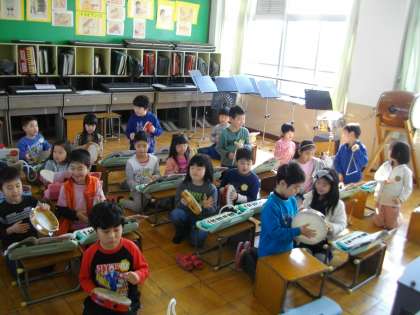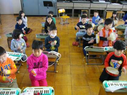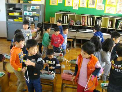 音楽では,合奏の学習をしています。タンバリン,トライアングル,カスタネット,すず,鉄琴などを使って,こいぬのマーチを演奏しています。いろいろな楽器に挑戦しています。