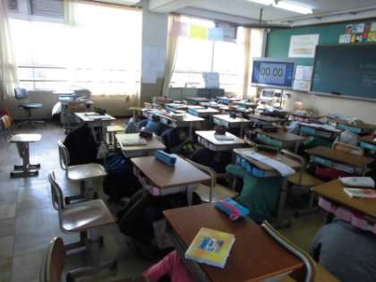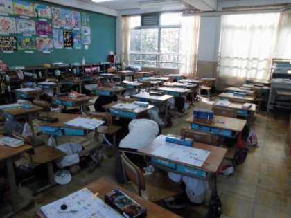 1年生から6年生まで,どの学年もしっかりと守ってできました。1年生は素早く机の下に身を隠すことができていました。さすが,もうすぐ2年生です。6年生は,体がずいぶん大きくなり,机の下に入るのが難しいのですが,まず頭を入れ,机の脚をもち,できるだけ体を小さくして,身を守っていました。