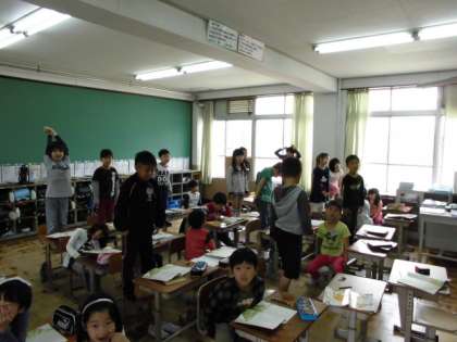 国語「ふきのとう」で音読をしました。イスの上に立っているのは,竹やぶ役の子どもたちで,イスに座っているのは雪役の子どもたちです。