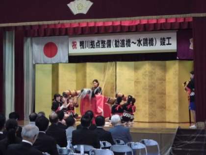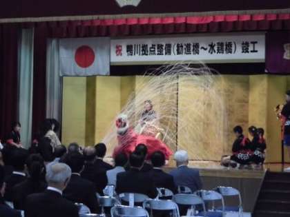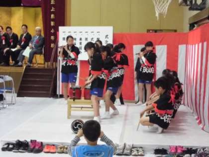 盛大な式典の中,たくさんの方々の前で,上鳥羽六斎ジュニアのみなさんが,見事な演技を披露してくれました。会場からは,何度も大きな拍手をいただきました。いつもと違う雰囲気で,緊張したことと思いますが,そんな様子も見せず,演じきった小中学生のみなさんの表情がとてもすがすがしかったです。