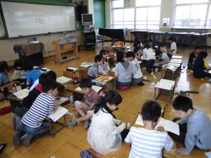 4人や5人のグループで話し合いは進みます。リズムができあがったところは,発表会に向けて練習をします。