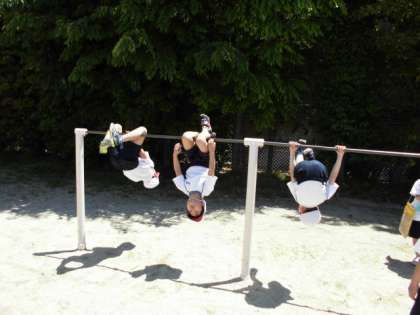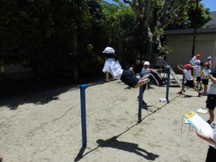 今日は,とてもいい天気でした。体育のてつぼうあそびでは,子どもたちが,さか上がりやこうもりふり,ちきゅうまわり,足ぬきまわりなど自分のできる技にチャレンジしました。