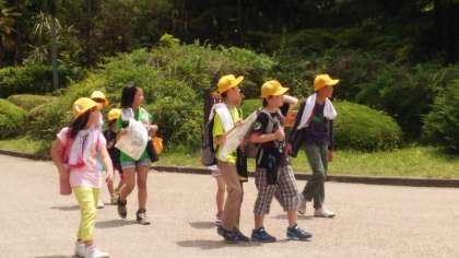 日陰で水分補給をしたり,みんなで歩く工夫をしながら頑張っています。