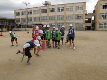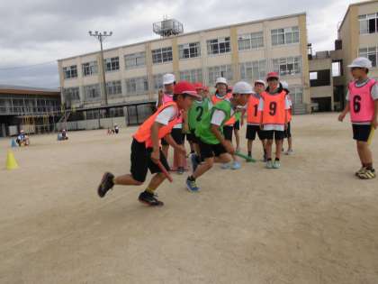 体育では,リレーをがんばっています。スタートの仕方は,前傾姿勢で。そして,カーブの走り方を工夫して走っています。