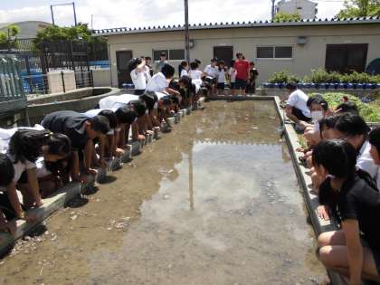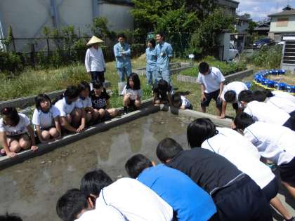 お話を聞いた後には,いよいよ田んぼに出ます。しっかりと観察した後は…