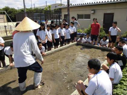 いよいよ代かきです。代かきは,土をねる感じで,土を踏んでいきます。代かきのコツを教えていただいた後は,いよいよ田んぼへ入ります。