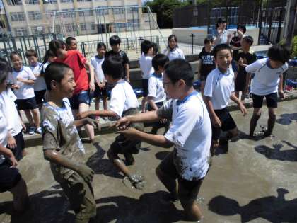 ついには足だけでなく,手でしっかりとこねてくれました。土がどんどん練られていきます。