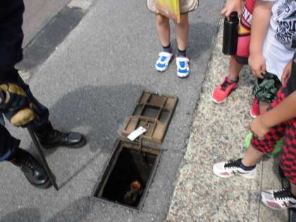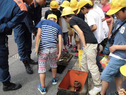 「消火活動で使う水は,消火栓からつないでいるから,消火栓の上には,車や自転車をとめないようにしないと!」「水道管の水だから,きれいな水なんだね。」「1分間で500Lの水をだすんだ!すごい量だね。」「地面にある消火栓だけじゃないんだ。地方によってちがうんだね。」いろいろなことを知ることができて,びっくりの連続でした!!