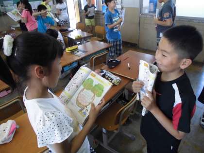 外国活動では,新しく学習した英語表現に慣れ親しめるように友達同士で話をします。たくさん使うことで,少しずつ慣れてきました。
