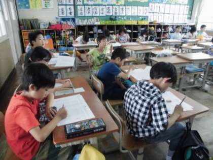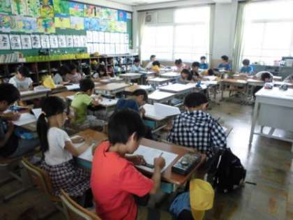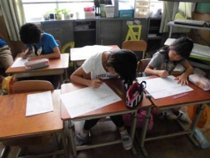 4年生もたくさんの算数の復習プリントを頑張っていました。わり算の筆算や折れ線グラフなどの問題に集中して取り組んでいました。