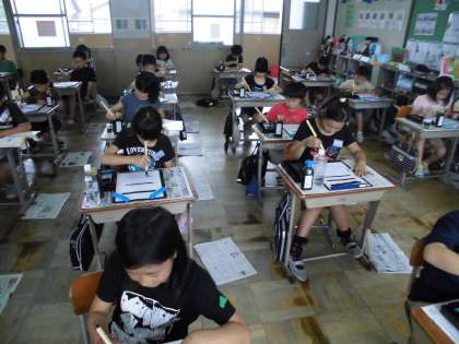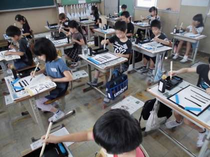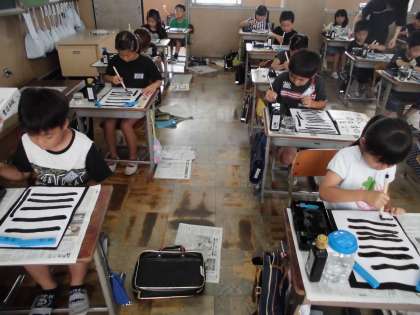 今日は準備・後片付けの仕方や筆の持ち方,書き方など基本的なことを学習をしていました。書くときは,「トン スー ピタ」意識して丁寧に線を書くことができました。