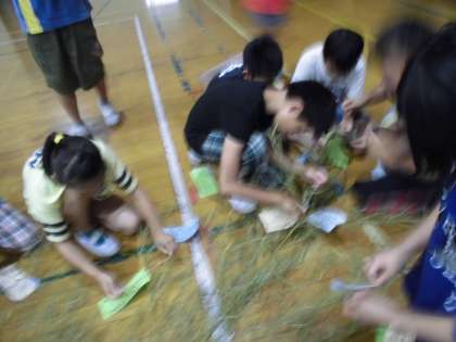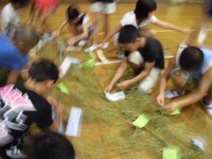 七夕のゆうべに向けて笹がやってきました。たくさんの願い事を書いた短冊とかざりをつけました。晴れるといいですね。