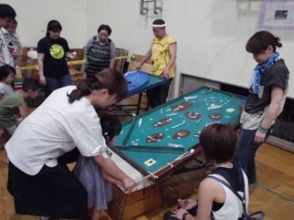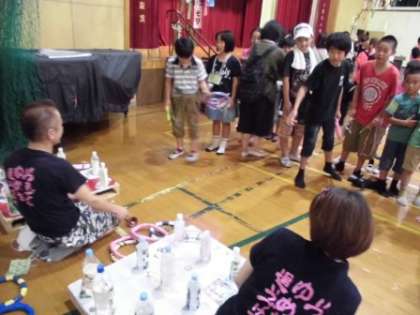 六斎ジュニアの演技の後は,スタンプラリーです。スマートボールやコマ回し,わなげ,けん玉,金魚すくい,かたぬきの各ブースで子どもたちも大人も楽しみました。全部のブースのハンコを集めると,おかしがもらえます。どのブースも大人気でした。